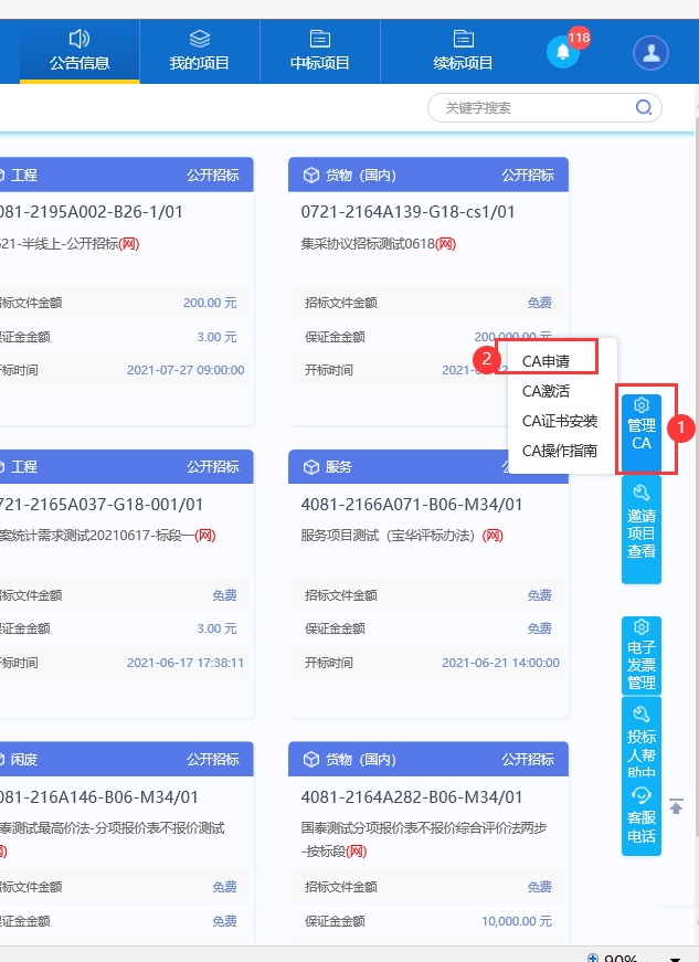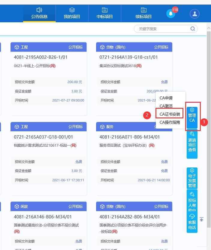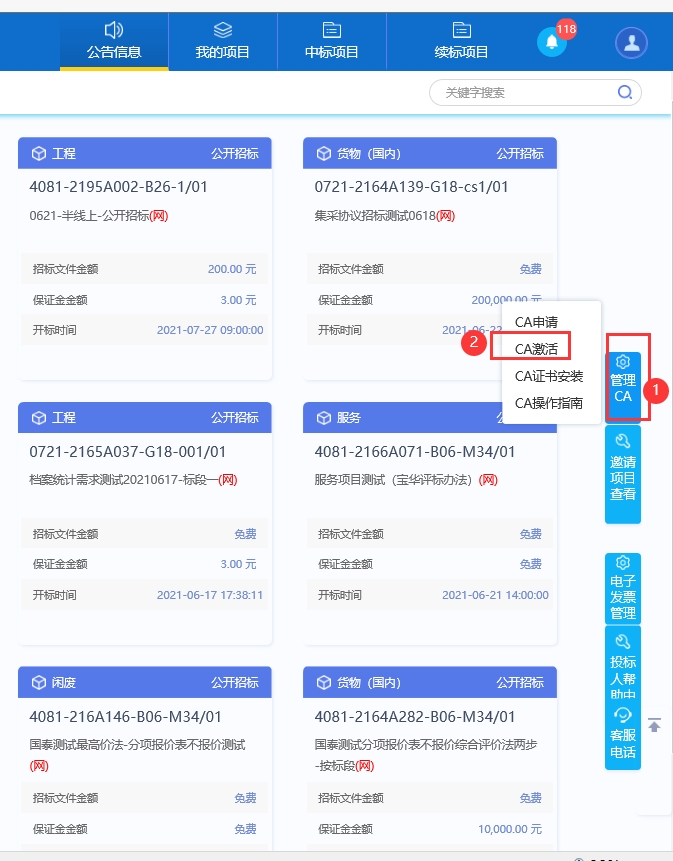 用户登录宝华智慧招标共享平台,点击右侧“管理CA”- “CA激活”,如图: