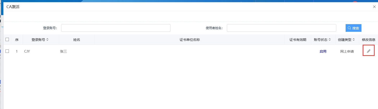 2.2.2 进入CA激活页,然后点击“修改信息”按钮进入CA绑定页面: