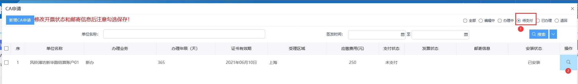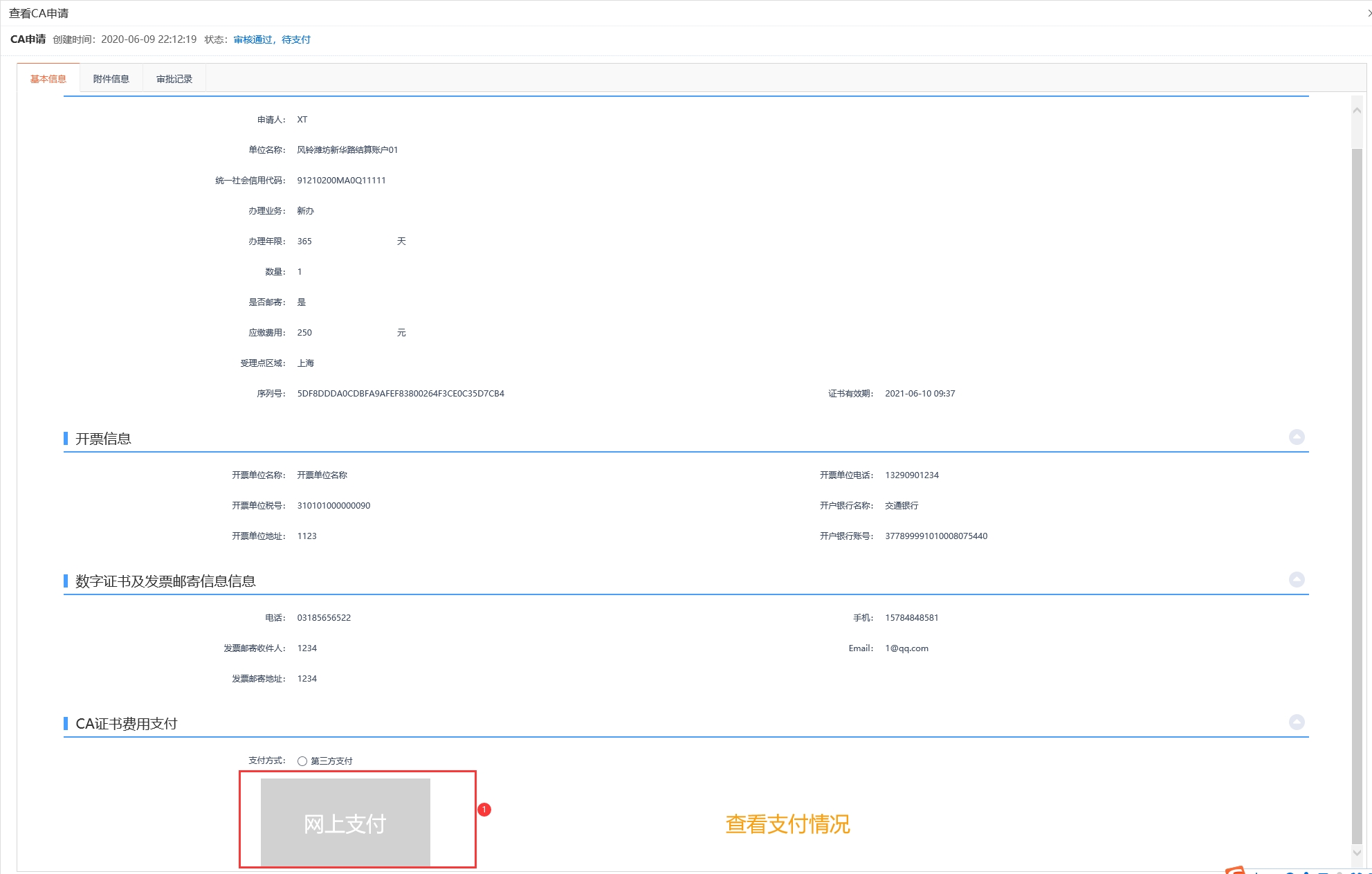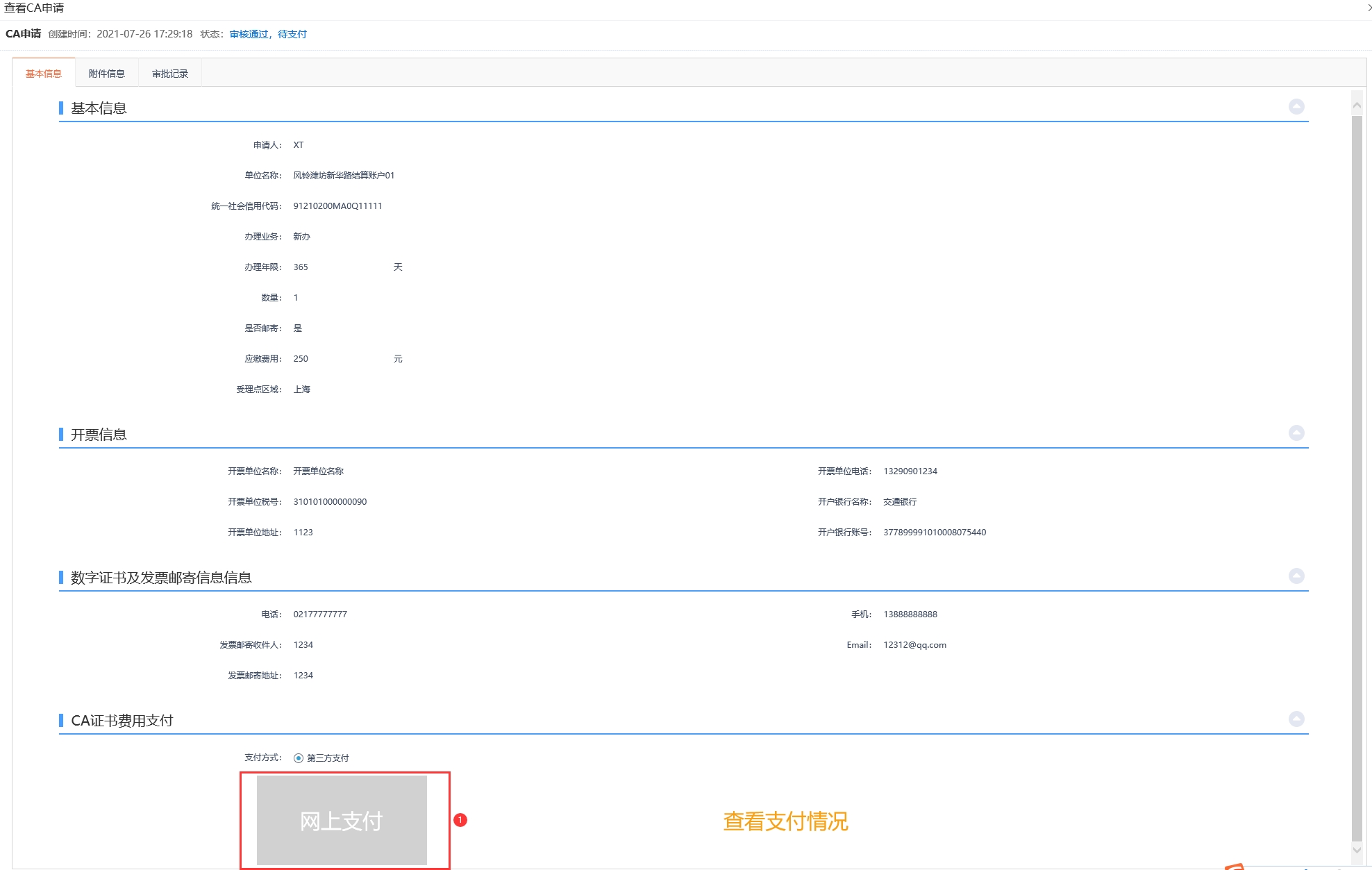 2.1.4 请提交成功,审核需半个工作日,审核通过后可支付证书费用。
