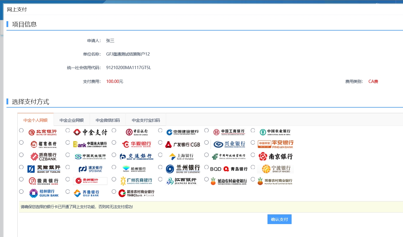 3.1.5 审核通过后,点击“网上支付”调转中金平台,支持企业/个人网银,微信/支付宝扫码支付。