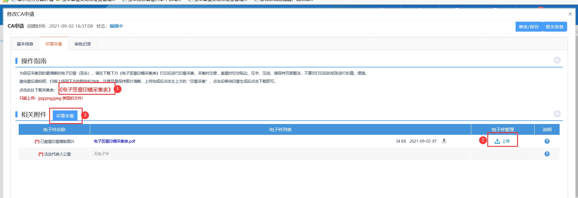 ①下载电子签章印模采集表,打印签上单位公章 ②上传已签章电子签章印模采集表 ③ 点击“印章采集”
