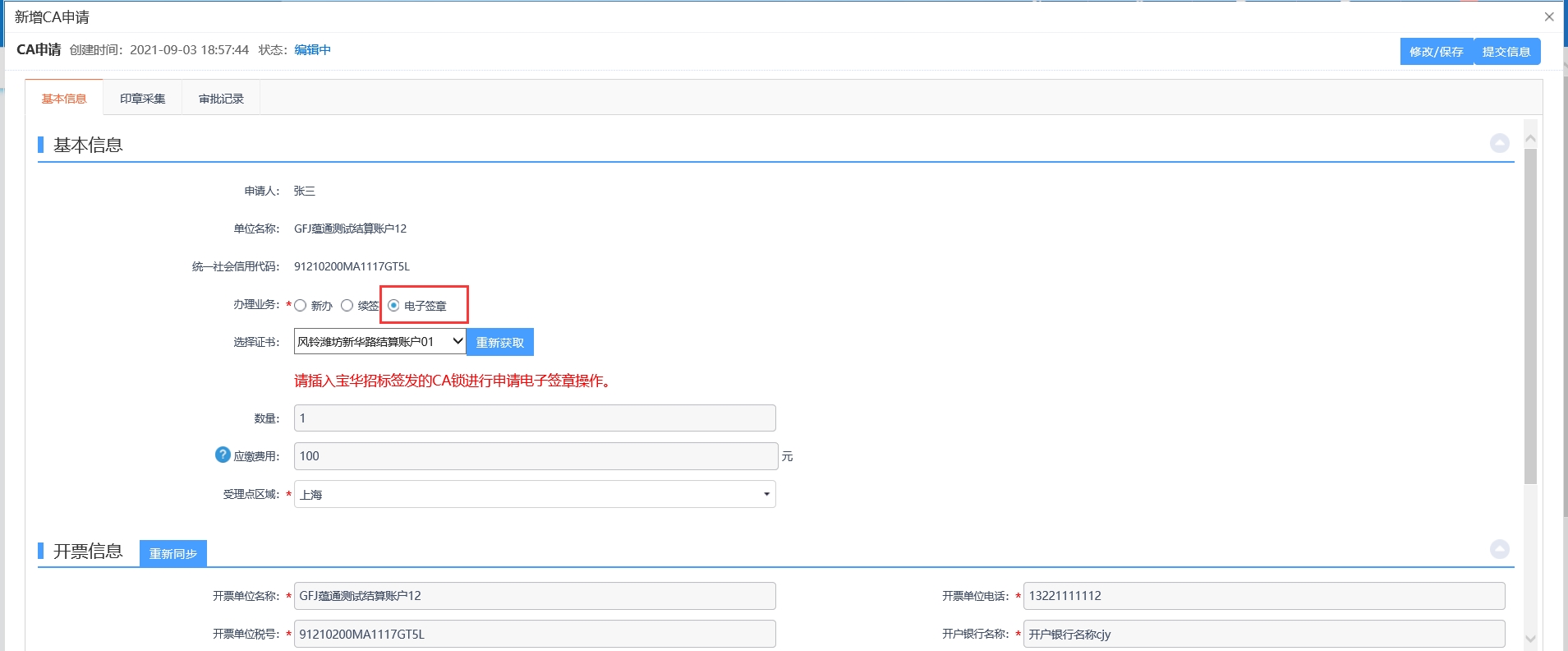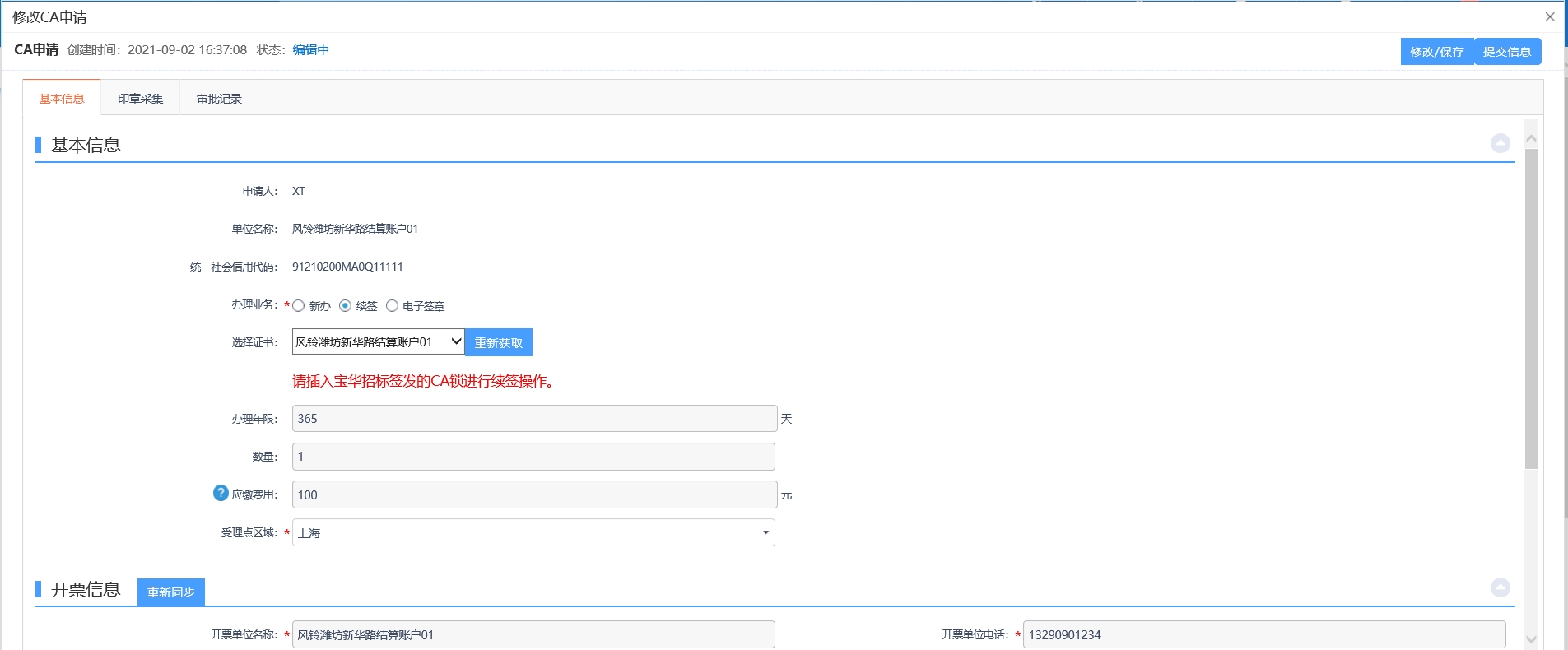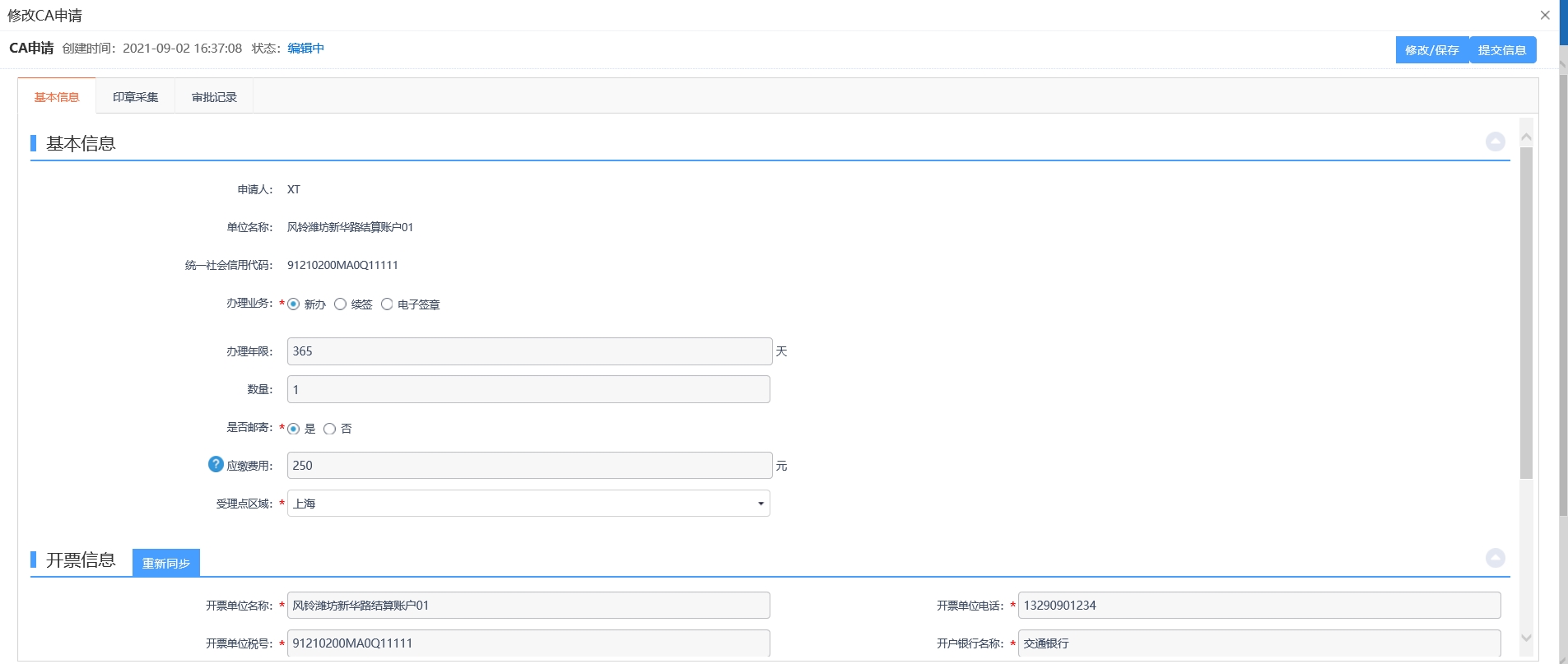 3.2.2 进入CA激活页,然后点击“修改信息”按钮进入CA绑定页面: