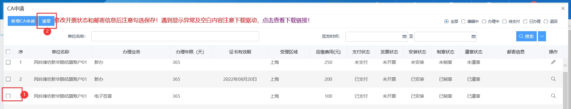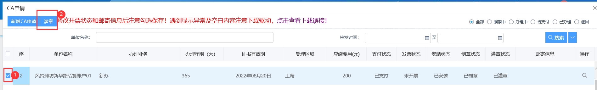 锁进行灌章。(必须为已完成制章电子签章申请数据方可进行灌章操作)
