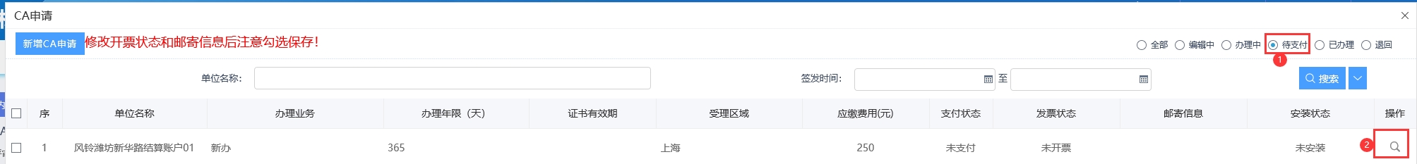 4.4 支付成功后 待中心端管理员进行制章,制章完成后,点击CA申请页面进行,插入申请CA