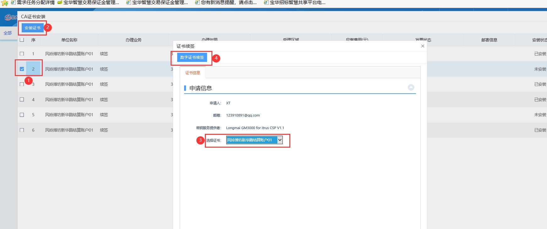 *注意一定要选择“续签”,续签需要插入宝华招标签发的CA锁进行续签操作。