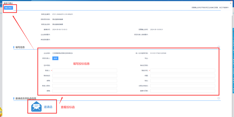 2.邀请书确认页面,可查看邀请函内容,完善投标信息,最后点击左上角确认参加,完成邀请函接收操作。