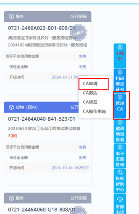 1 用户登录宝华智慧招标共享平台,点击右侧“管理CA”- “CA申请”,如图: